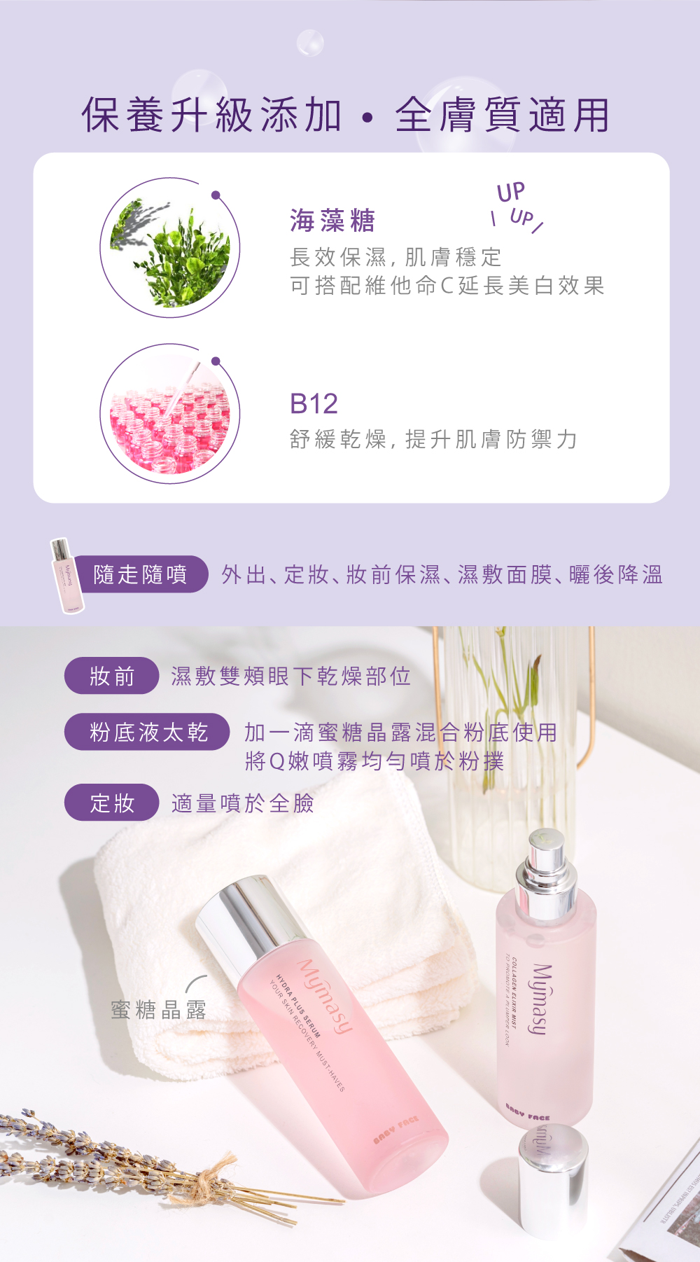 早晚於臉部清潔後,適量噴於全臉跟脖子,輕拍按壓臉部肌膚避開眼、唇部位,靜待臉部吸收。