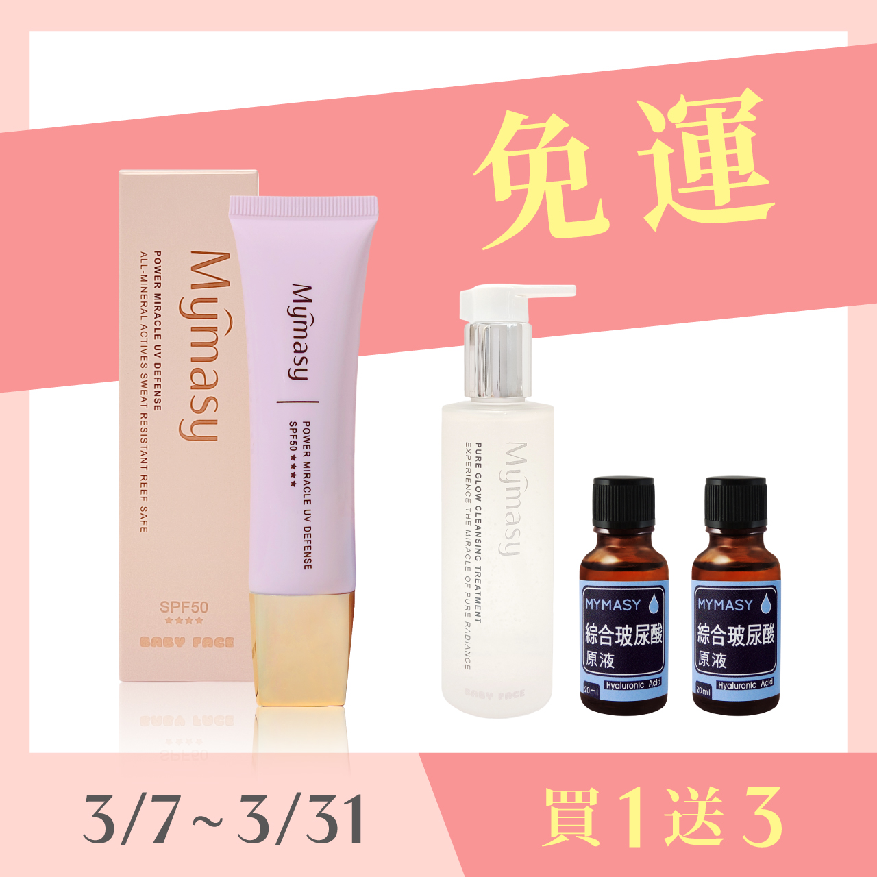 隔離乳30ML x1、卸妝凝露150ML x1、玻尿酸原液20ML x2