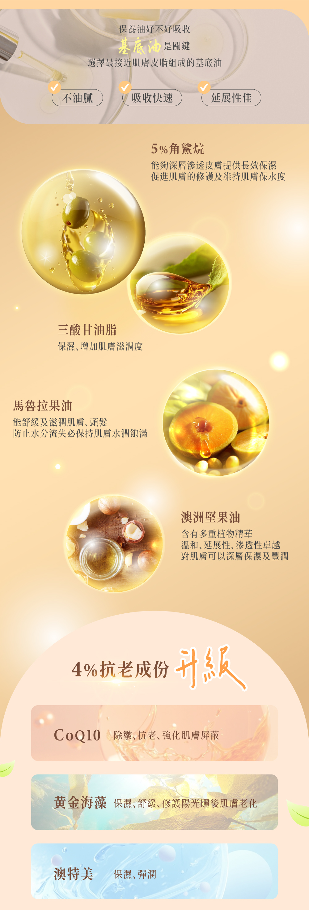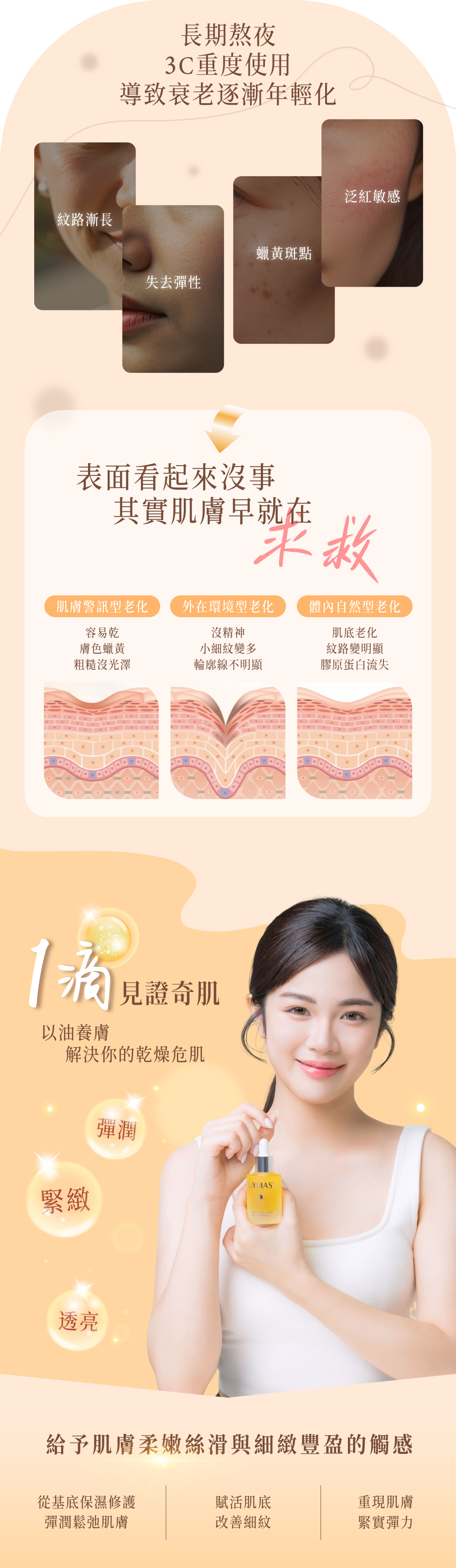 彈潤、緊緻、透亮 ,極緻凍齡黃金美容精華油,1滴見證奇肌解決妳的乾燥危肌。